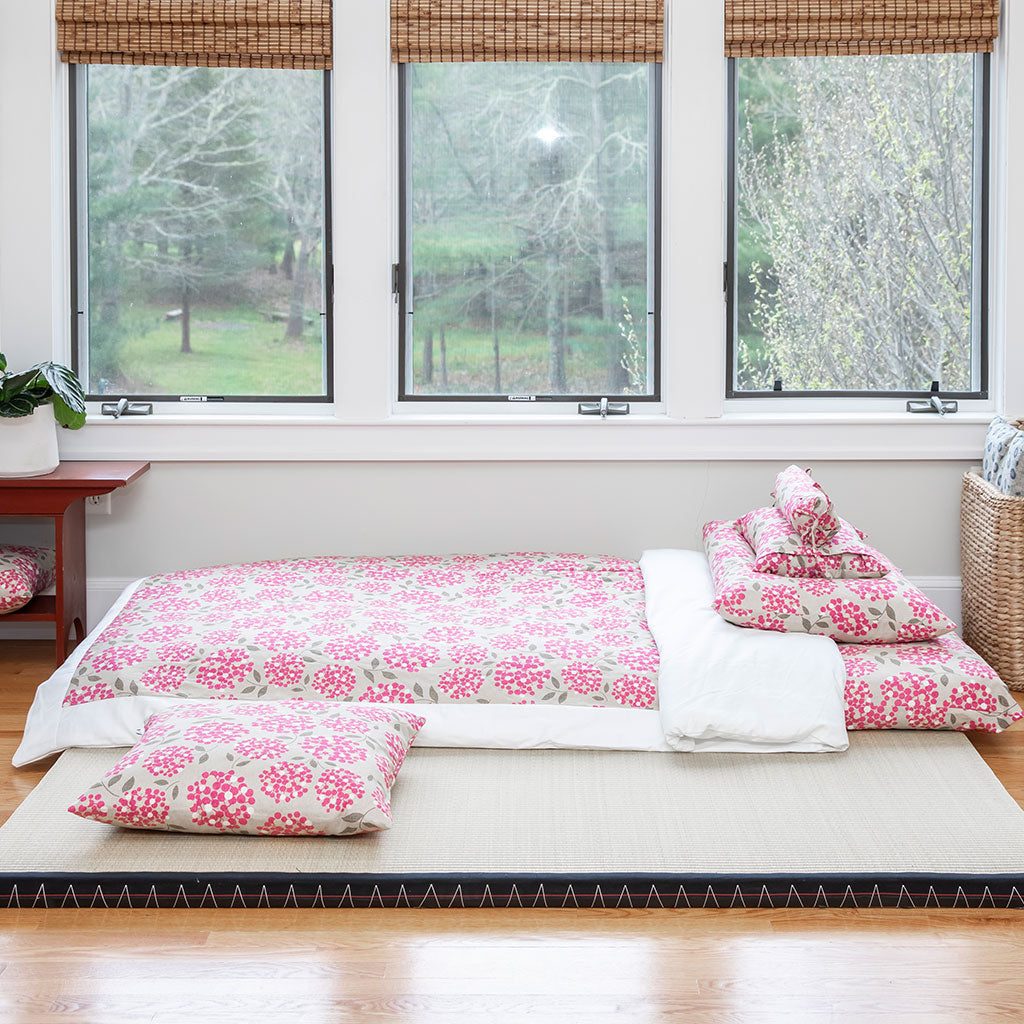 Complete the look of your Japanese bed set with Japanese decorative pillows. Our Japanese style throw pillows are ideal for accenting any sofa, bed, or chair. These custom square throw pillows let you mix and match various J-Life fabrics with your shikifuton covers, kakefuton covers, or other J-Life pillows.