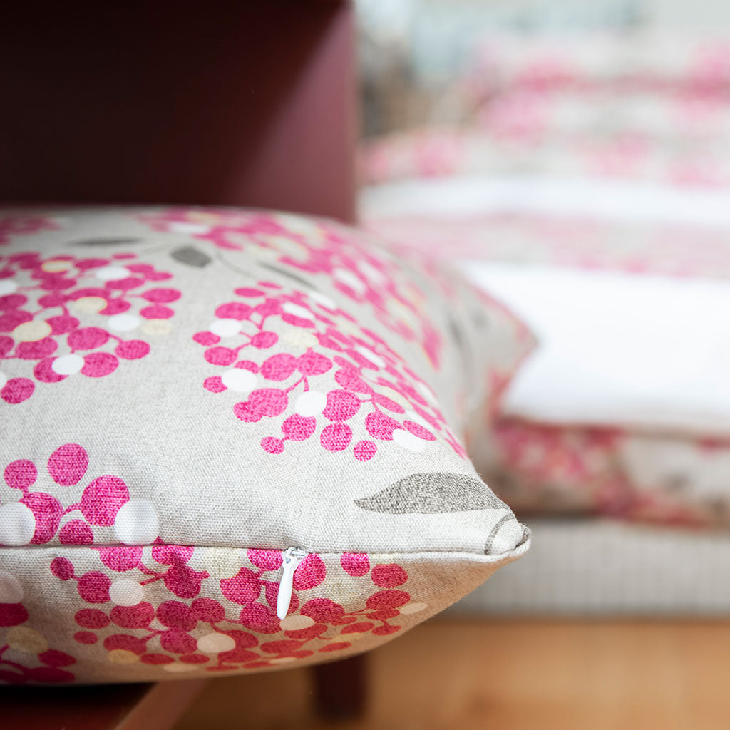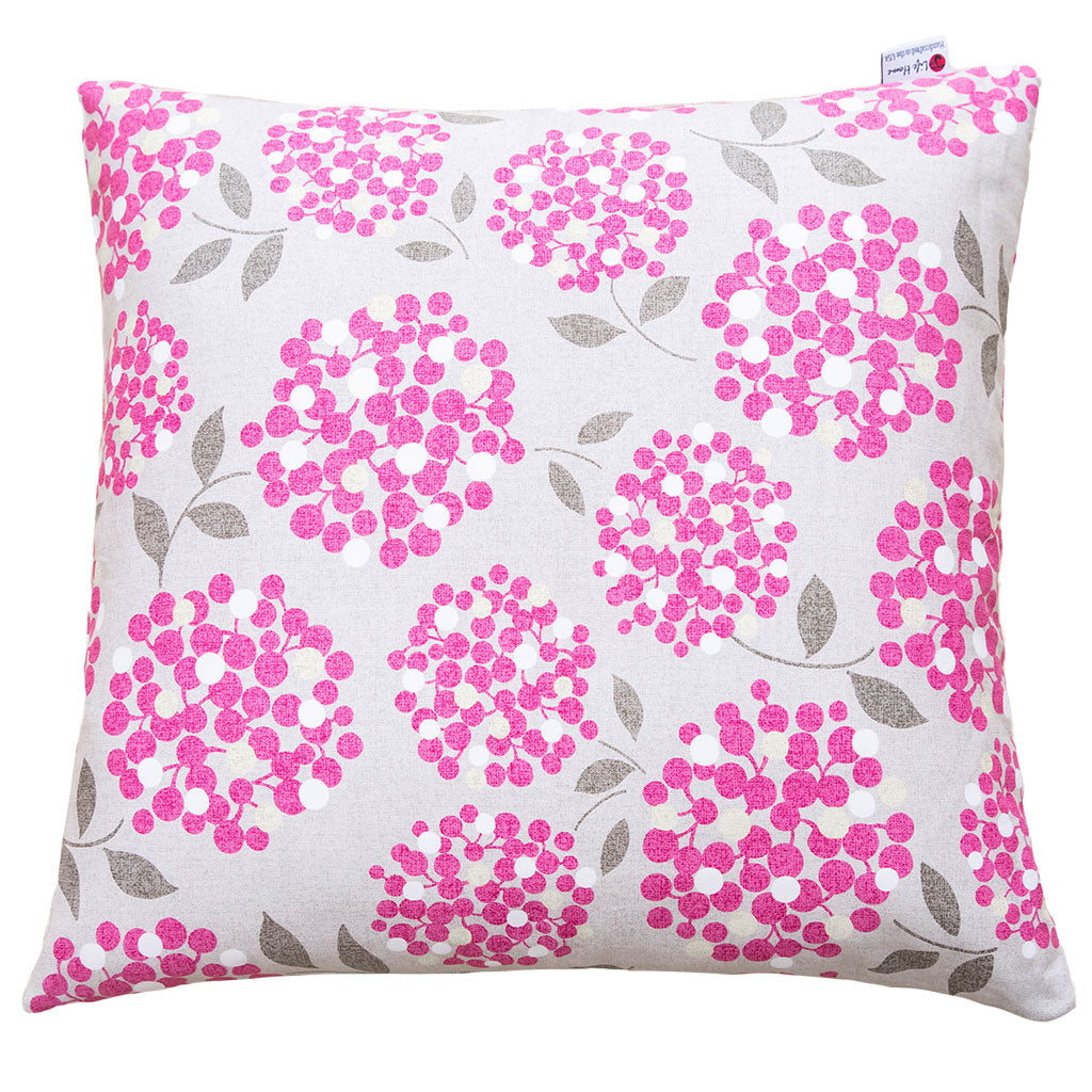 Each 18" pillow cover is handmade to order in the USA of 100% cotton fabric. This style is covered in a graphic pink floral pattern on a gray background. Ajisai (紫陽 花) is the Japanese word for hydrangea, a type of flower that symbolizes love, gratitude, and sincerity in Japanese culture.