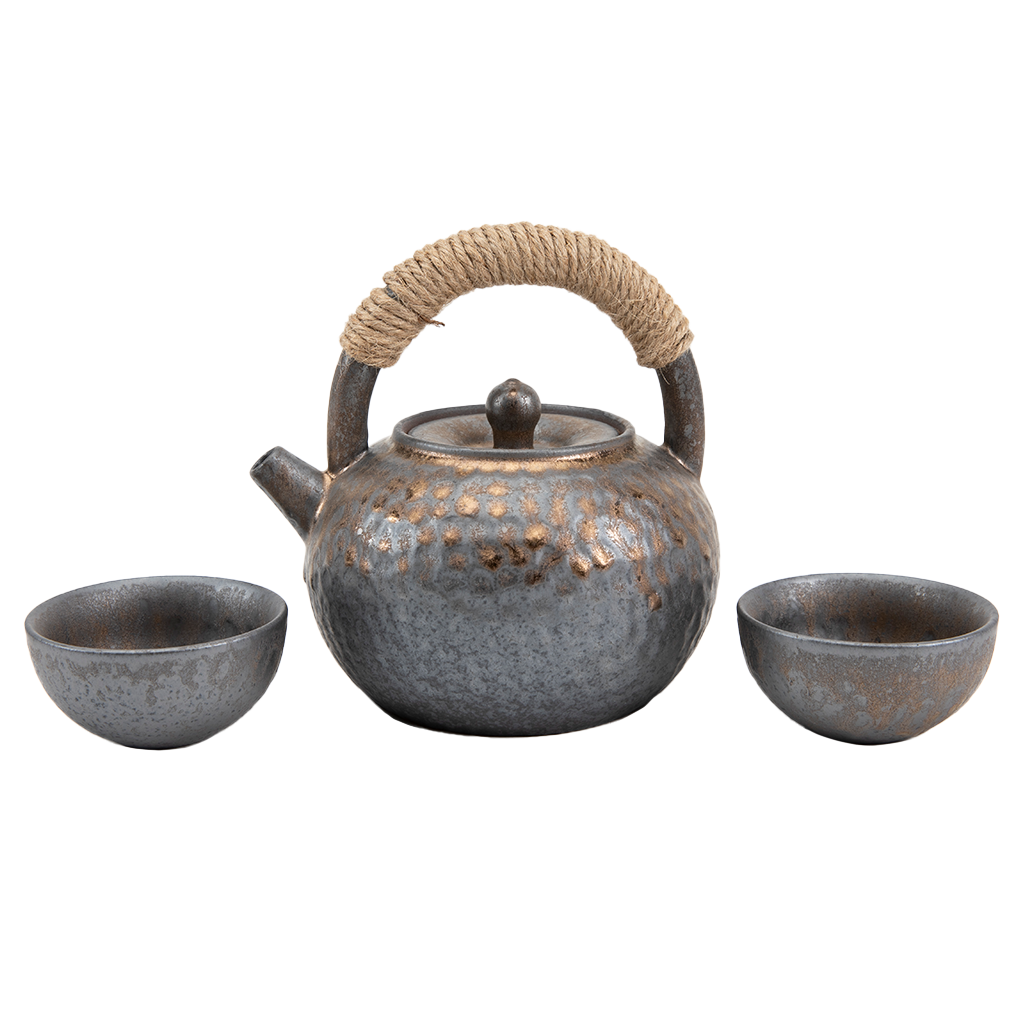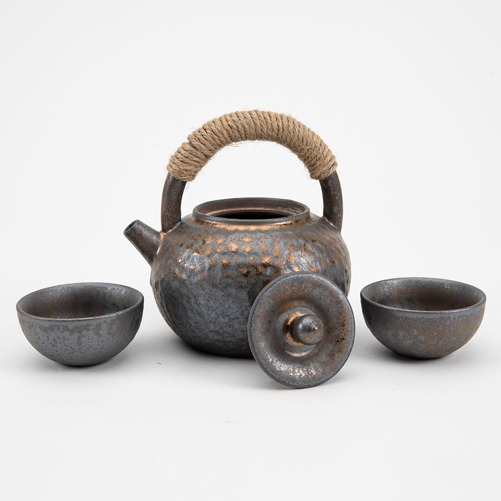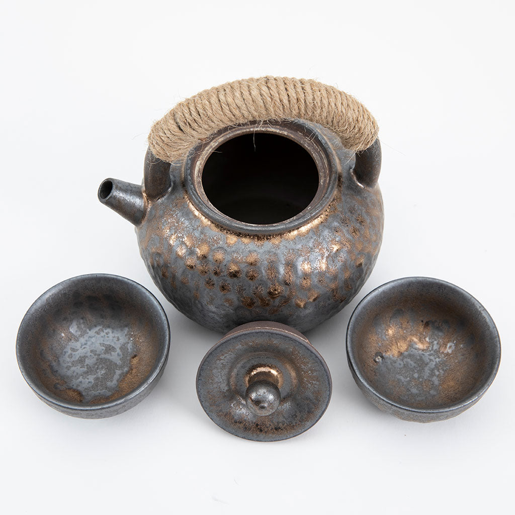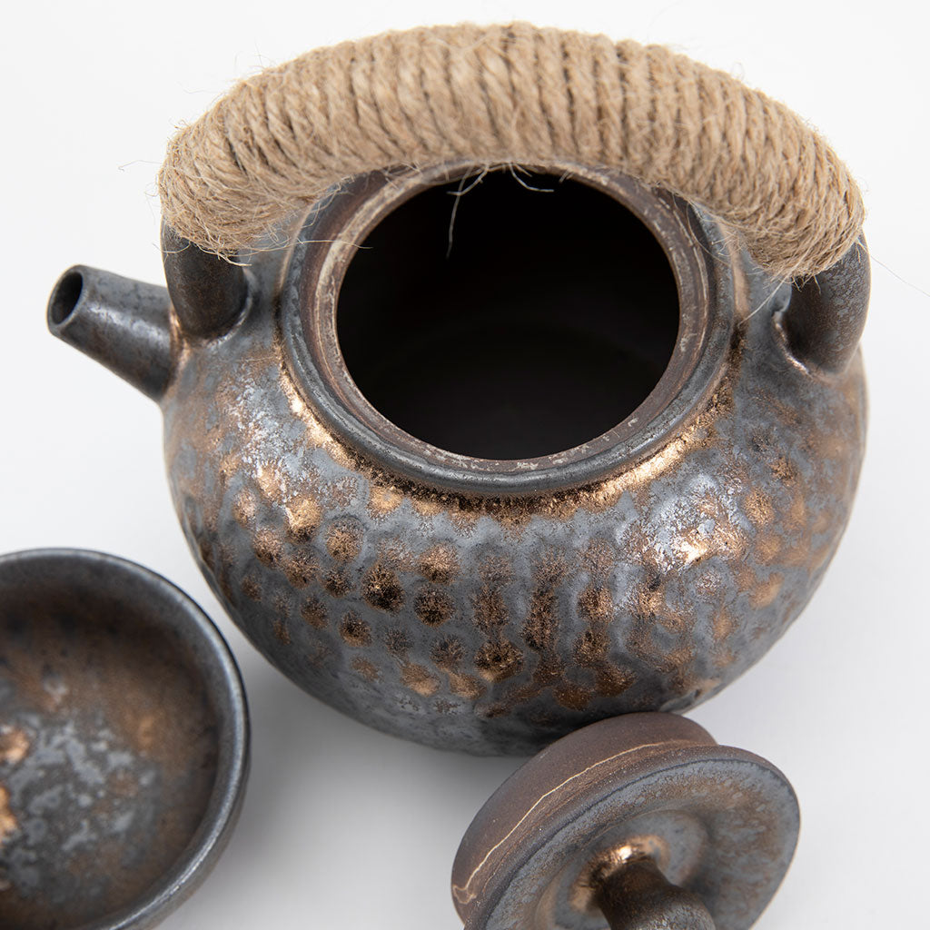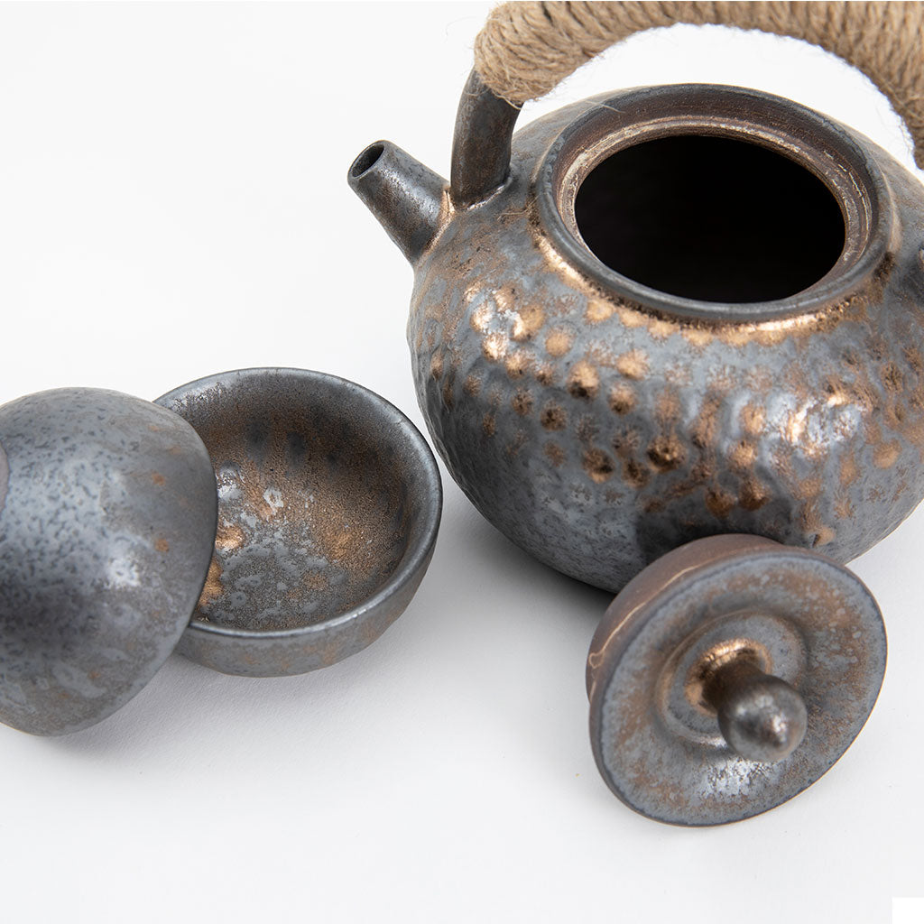 This handcrafted ceramic teapot with a matching tea cup set features a hammered metal design, giving it a rustic yet refined aesthetic. Paired with matching cups, it evokes a sense of harmony and balance, perfect for enjoying a Japanese tea ceremony or casual gathering.
