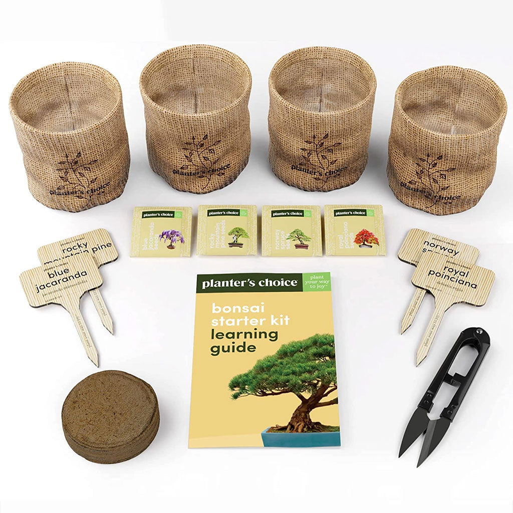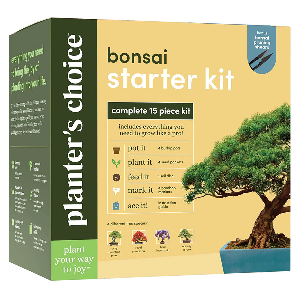The Complete Mini Bonsai Starter Kit contains everything you need to grow 4 unique species of indoor bonsai trees: Rocky Mountain Pine, Blue Jacaranda (Black Poui), Norway Spruce, and Royal Poinciana (Flame Tree). This kit is suitable for beginners and experts alike.