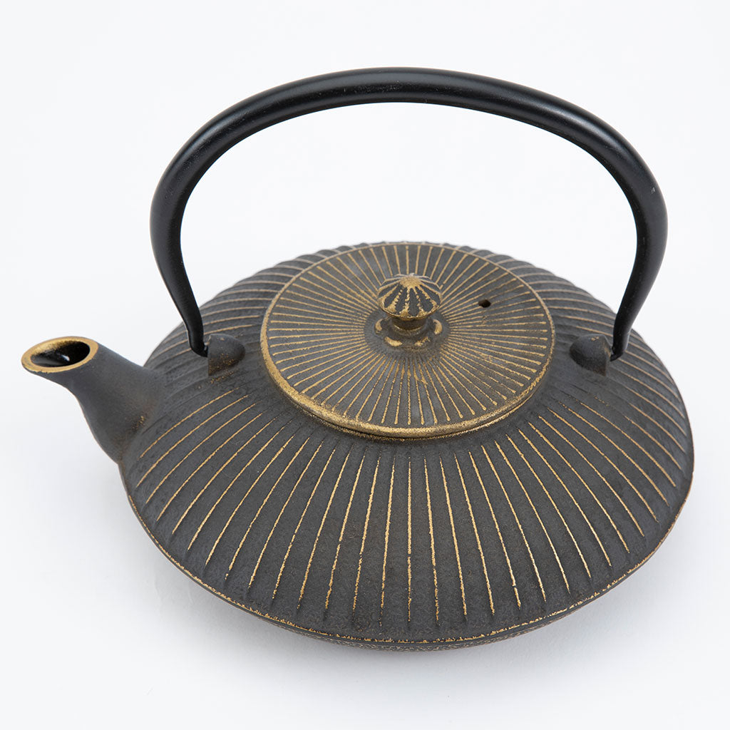 Keep your favorite Japanese tea warm and fresh in this sturdy Cast Iron Teapot with gold finish. This piece is carefully crafted of solid cast iron, featuring a gold painted finish with a geometric design.