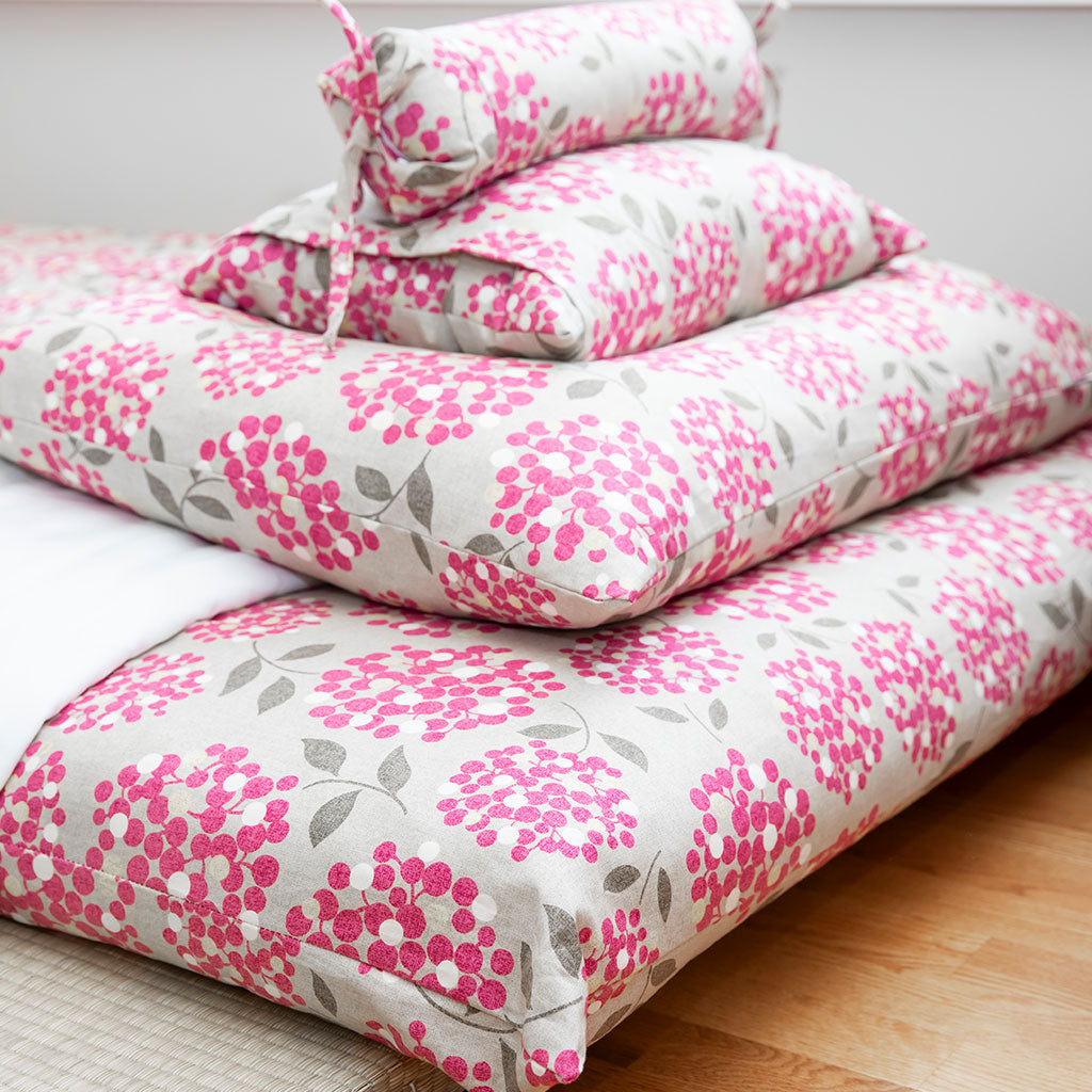 This pillow cover is covered in a graphic pink floral pattern on a gray background. Ajisai (紫陽 花) is the Japanese word for hydrangea, a type of flower that symbolizes love, gratitude, and sincerity in Japanese culture.