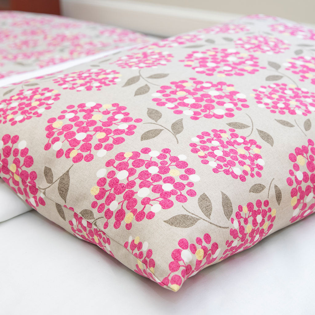 This lovely Japanese pillow cover is made of imported traditional Japanese fabric, featuring the same fabric on both sides. This style is covered in a graphic pink floral pattern on a gray background. Ajisai (紫陽 花) is the Japanese word for hydrangea, a type of flower that symbolizes love, gratitude, and sincerity in Japanese culture.