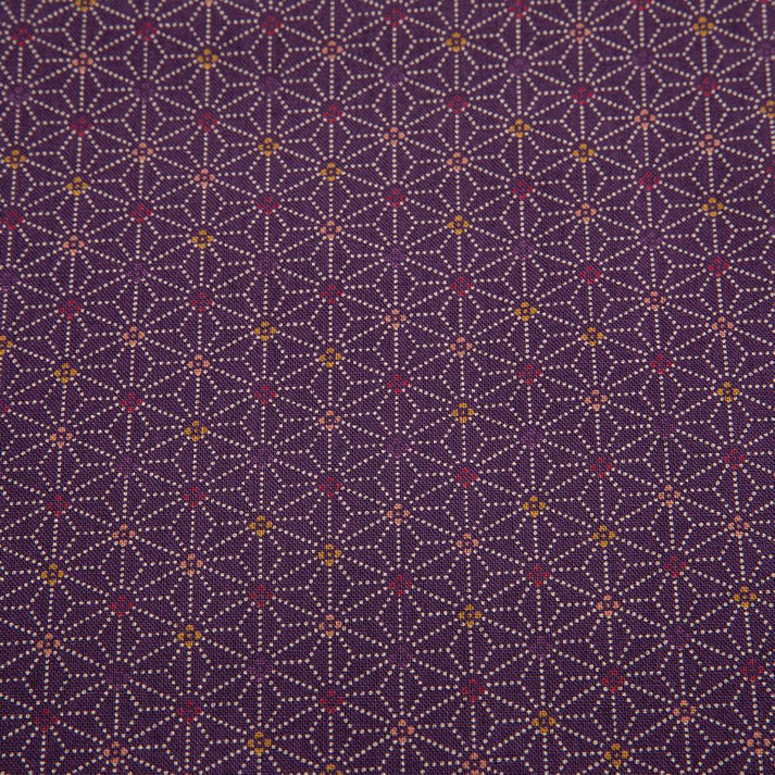 This buckwheat pillow features a gold and maroon asa no ha print on solid purple fabric. You can learn more about this traditional Japanese pattern on our blog.