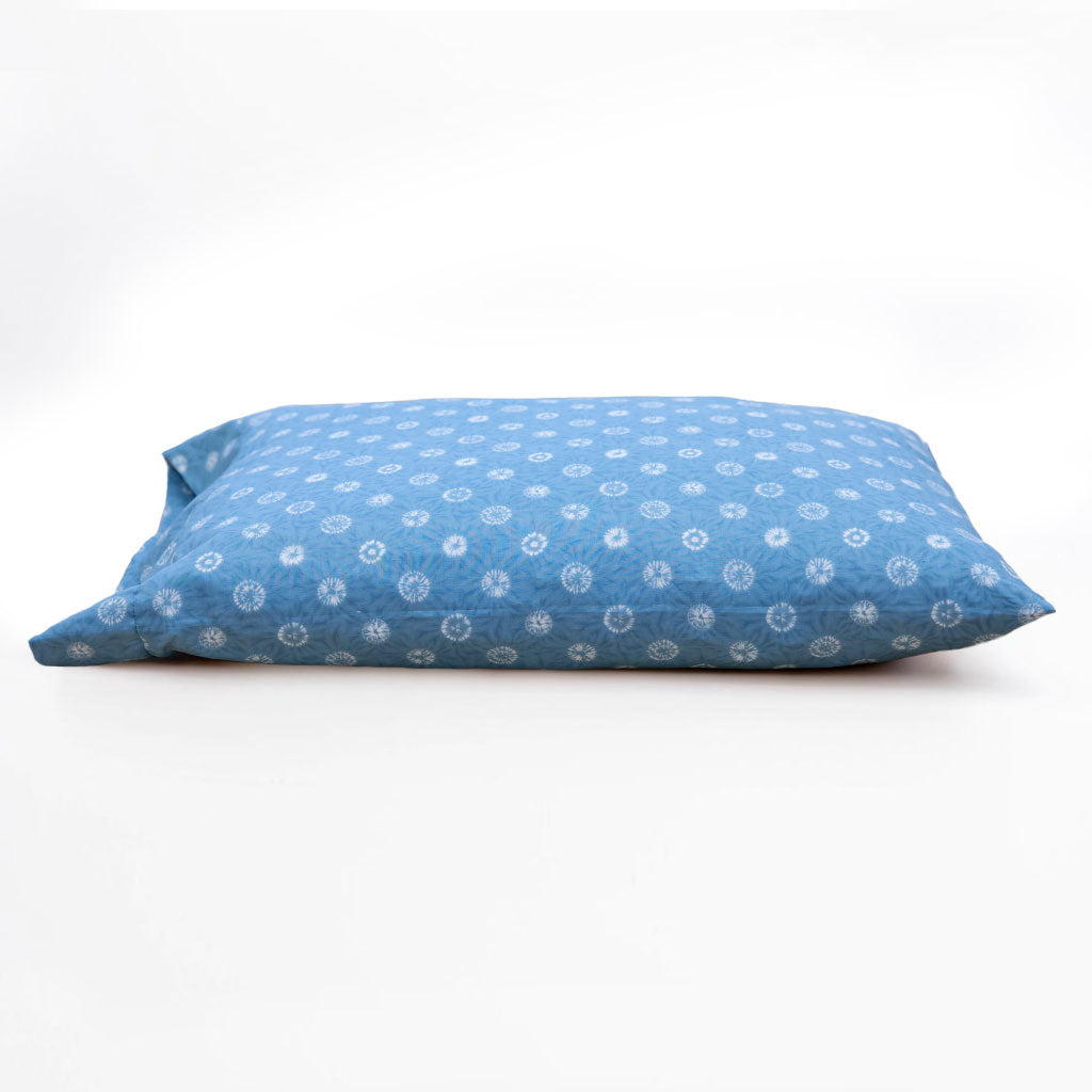 This lovely Japanese pillow cover is made of imported traditional Japanese fabric, featuring the same fabric on both sides. This style features a blue and white traditional Japanese shibori style dot print that resembles fluffy dandelion plants.