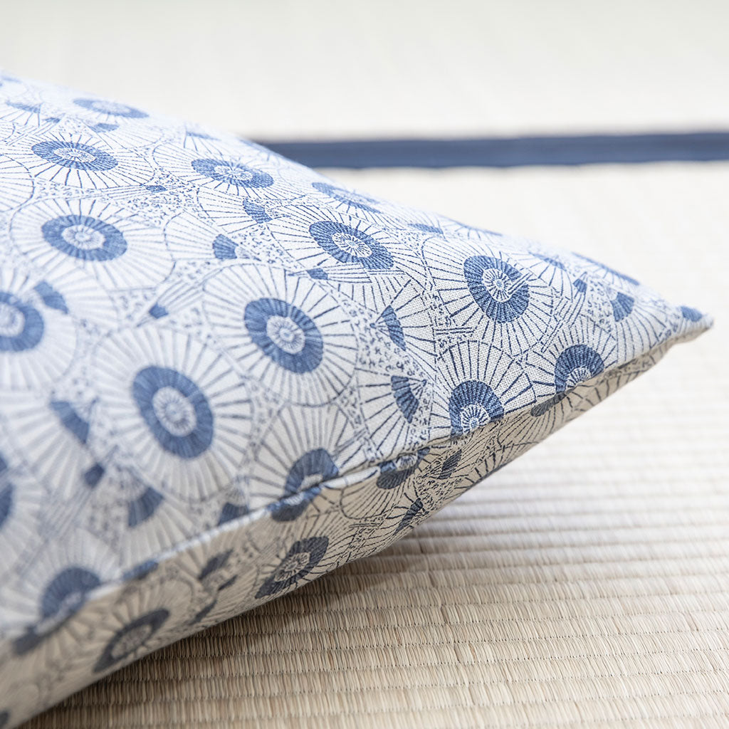 This buckwheat pillow is decorated with a white Japanese parasol (higasa; 辻倉) and traditional hand fan (sensu; 扇子) pattern with blue accents.