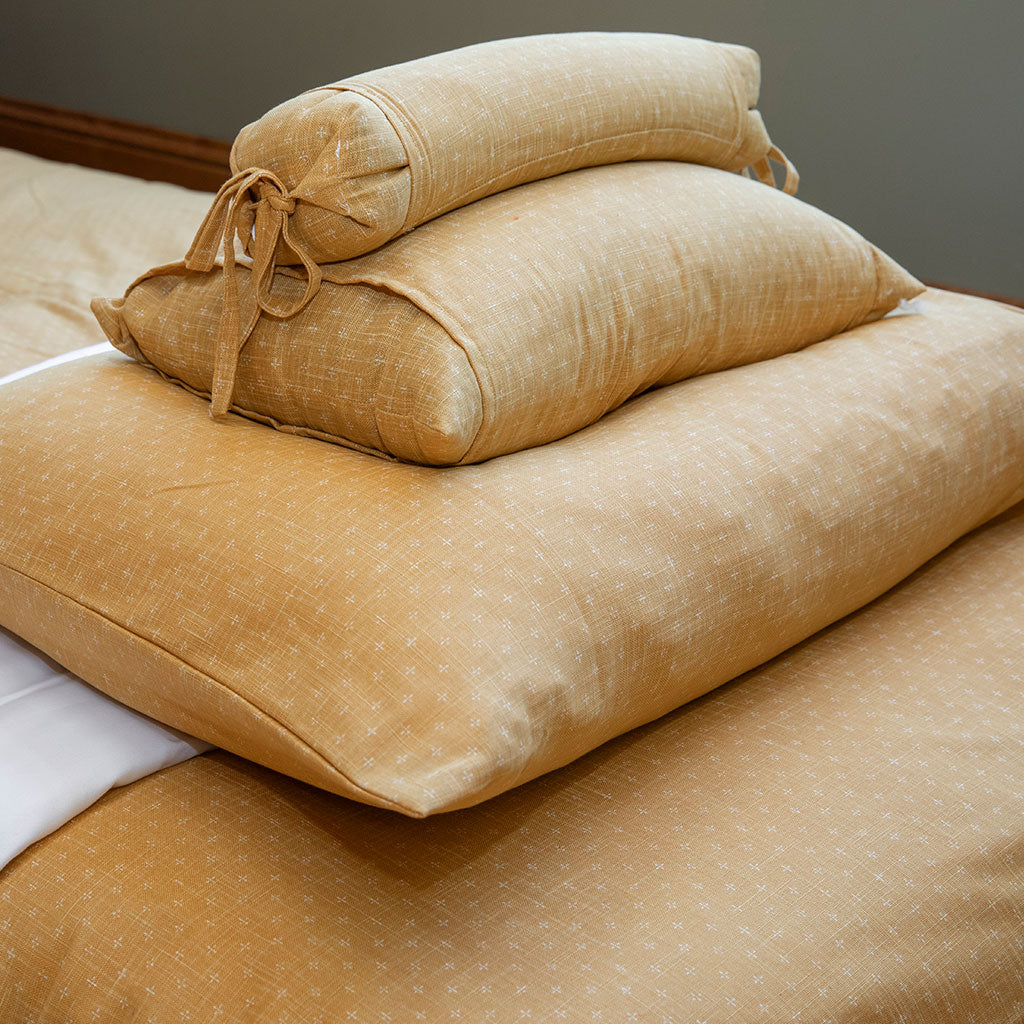 Inspired by the Japanese word kin (金), meaning “gold,” this fabric brings a warm, sunlit glow to your sleeping space. The soft golden hue and subtle crosshatch pattern reflect both refinement and comfort—like the calm radiance of afternoon light. Kin Gold blends traditional Japanese textile design with an inviting modern tone, perfect for a peaceful and grounded rest.