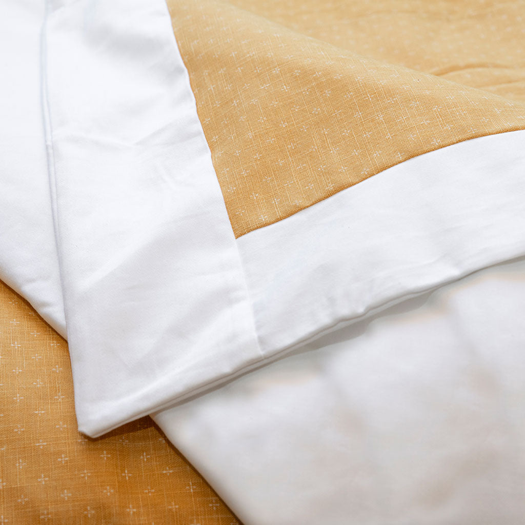 Inspired by the Japanese word kin (金), meaning “gold,” this fabric brings a warm, sunlit glow to your sleeping space. The soft golden hue and subtle crosshatch pattern reflect both refinement and comfort—like the calm radiance of afternoon light. Kin Gold blends traditional Japanese textile design with an inviting modern tone, perfect for a peaceful and grounded rest.