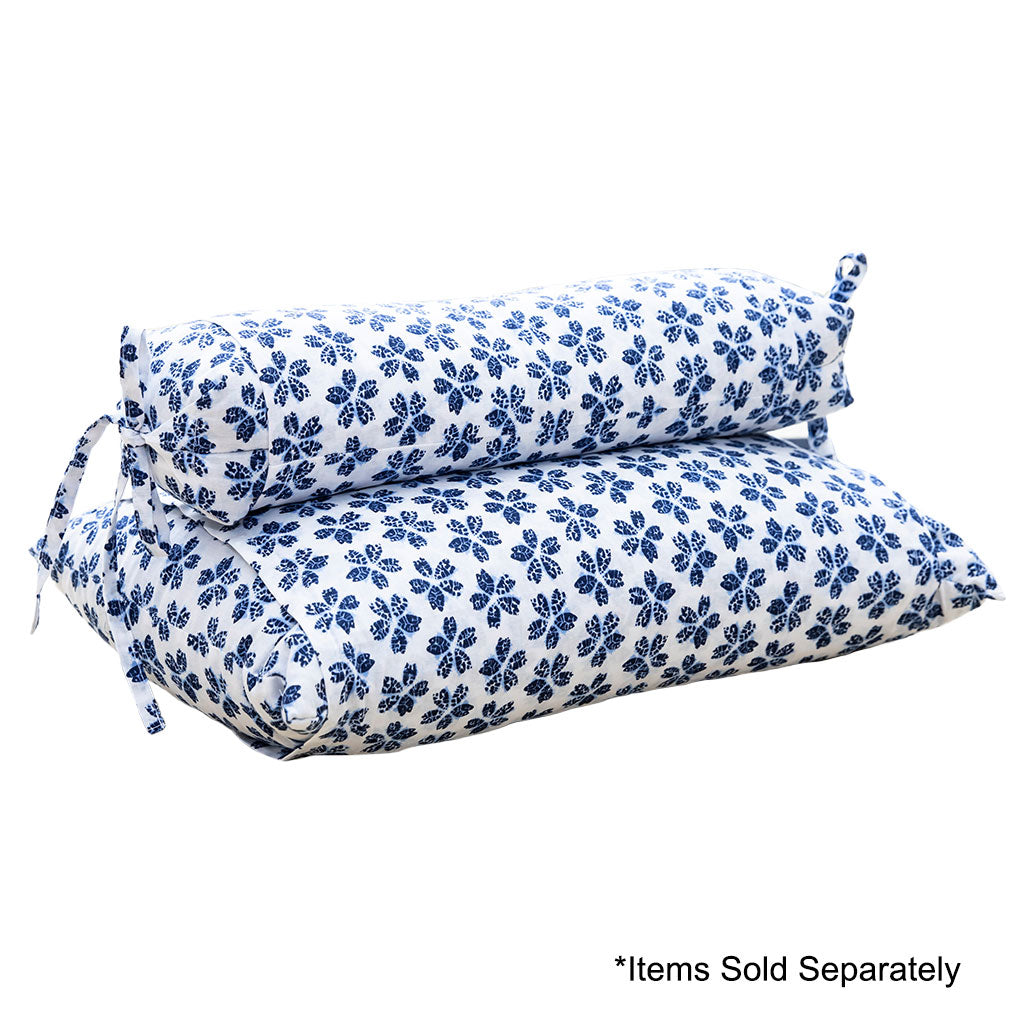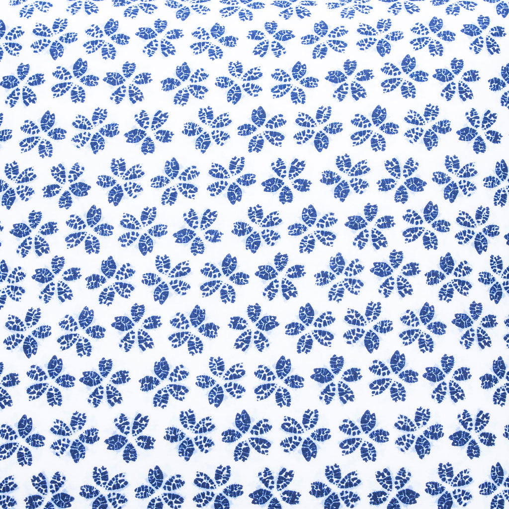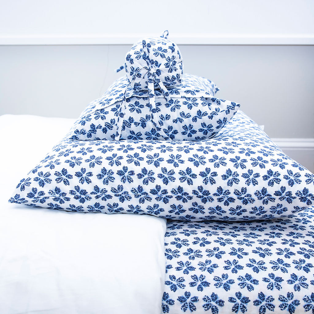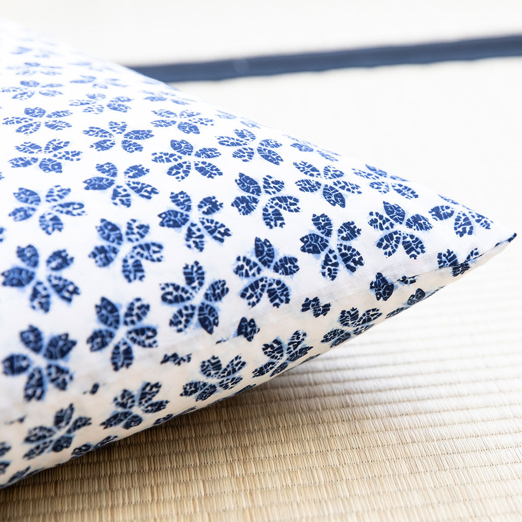 This Japanese pillow cover is decorated in an elegant blue floral pattern on a white ground.