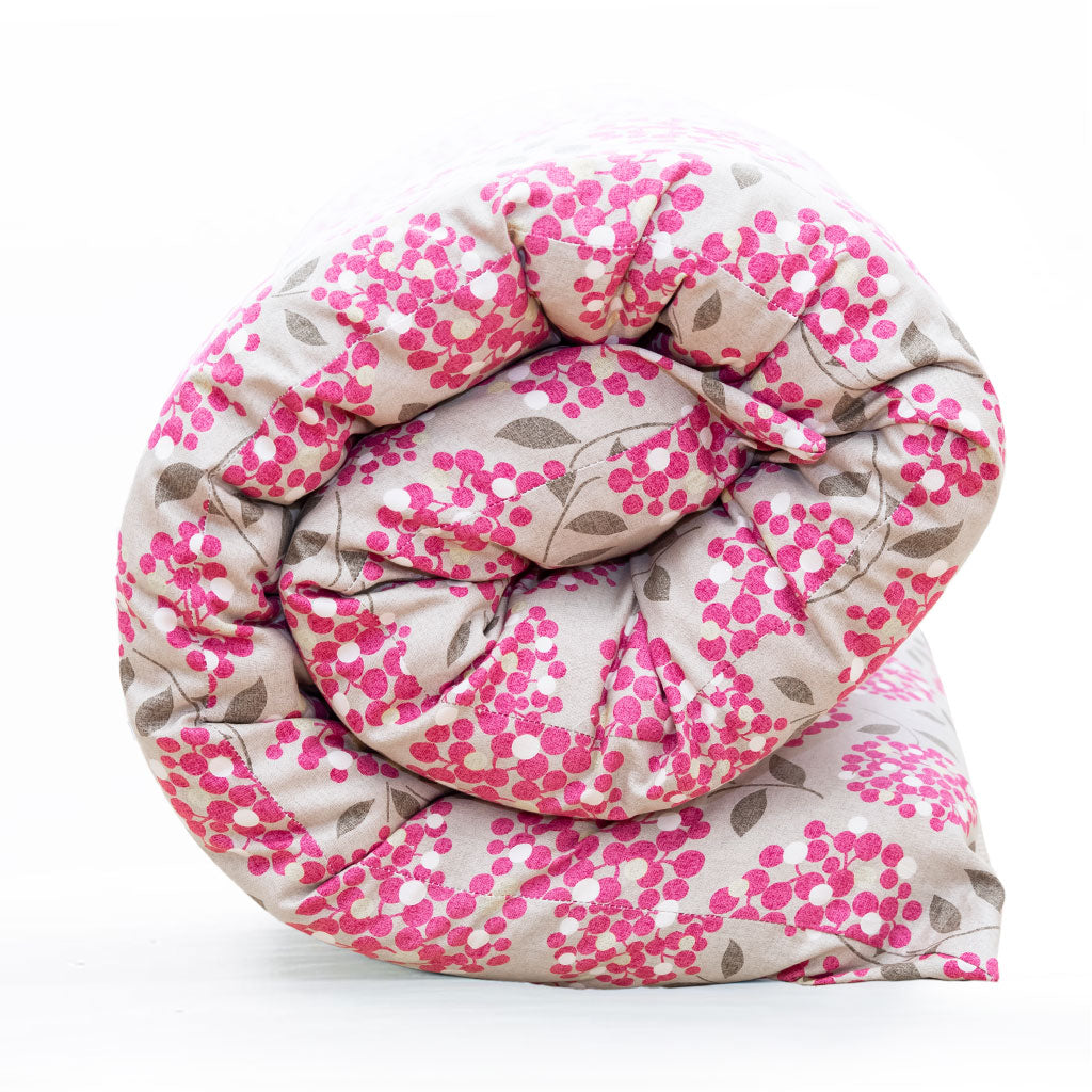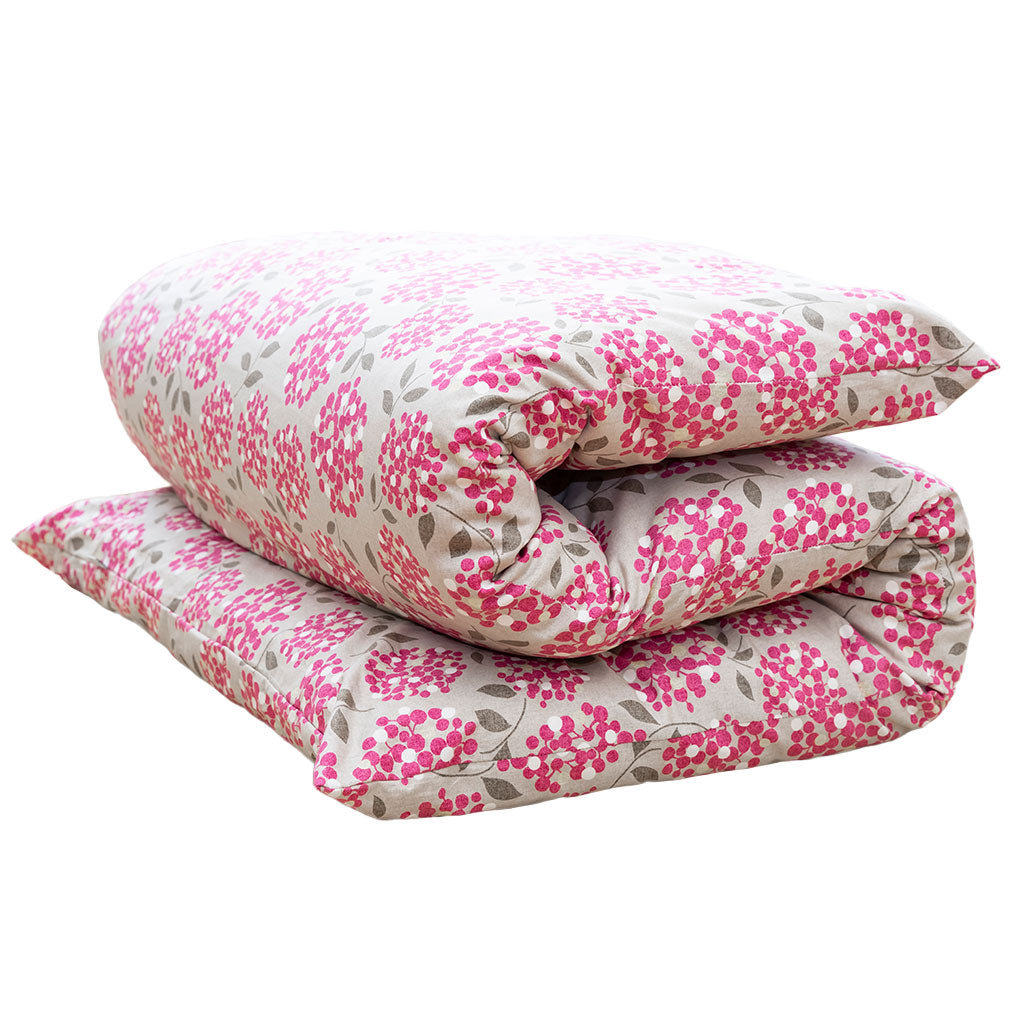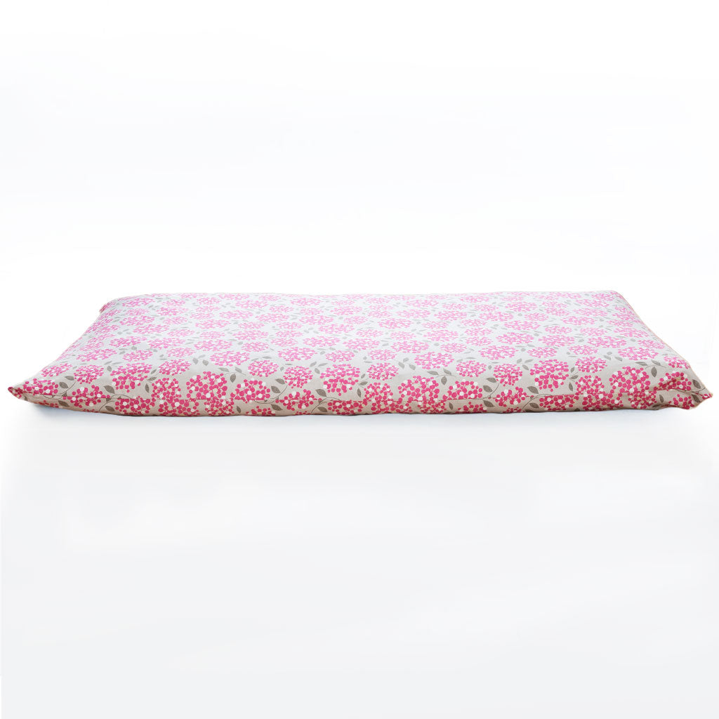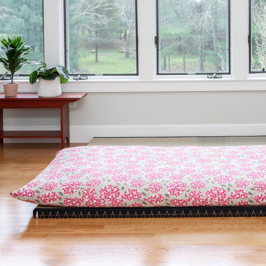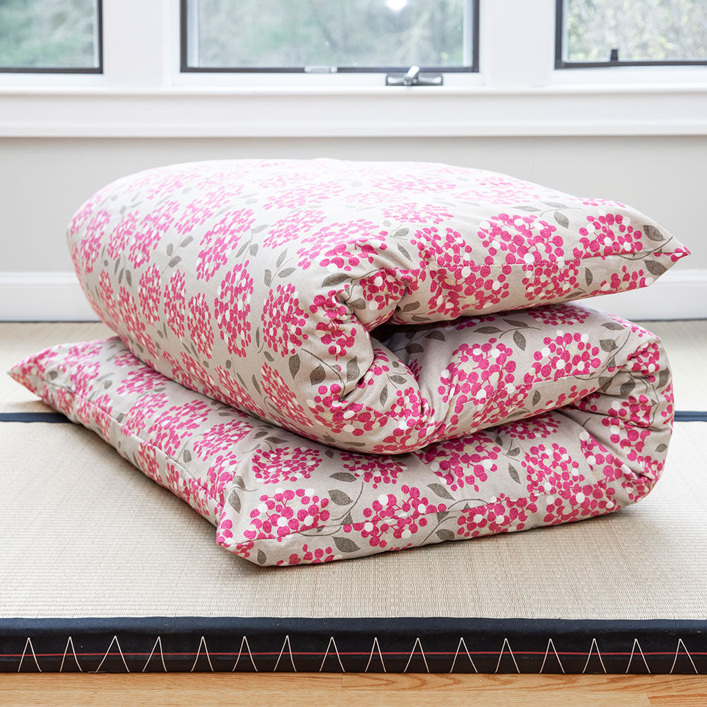 This futon cover is covered in a graphic pink floral pattern on a gray background. Ajisai (紫陽 花) is the Japanese word for hydrangea, a type of flower that symbolizes love, gratitude, and sincerity in Japanese culture.