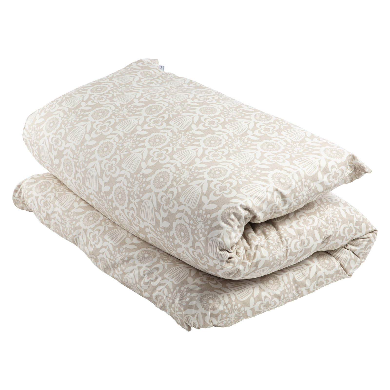 This futon cover features a graphic floral motif in white on tan fabric. Each of the flowers in this pattern is sacred in Japanese culture: the tulip, peony, chrysanthemum, and cherry blossom. Visit our blog to learn more.