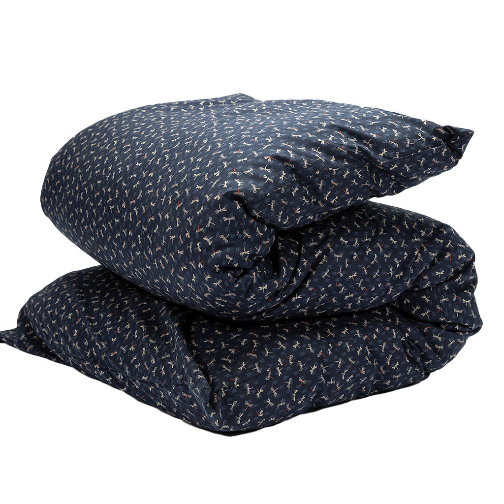 This futon cover features a white and blue dragonfly pattern on navy fabric.