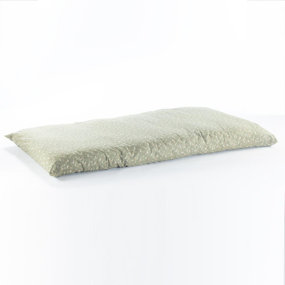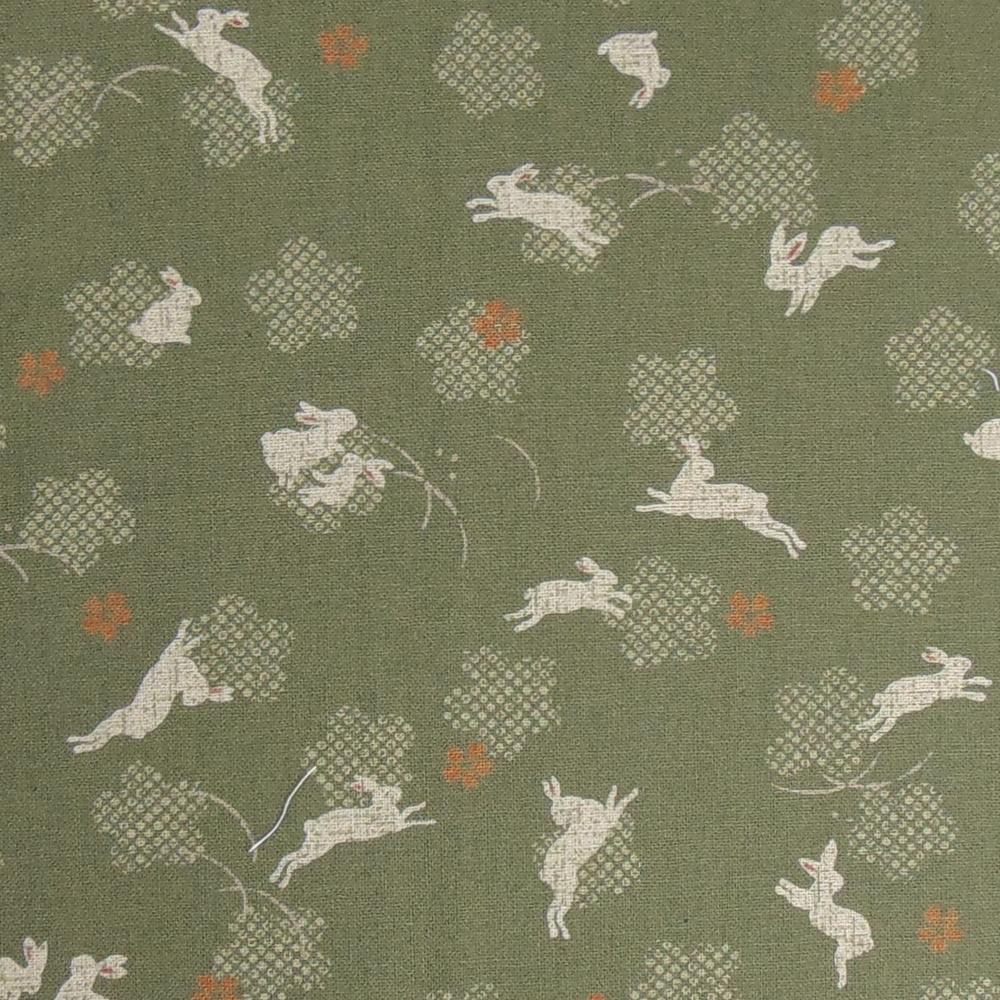 This futon cover features a playful bunny pattern with sakura flower detail printed on olive green fabric. Visit our blog to learn more about rabbits in Japanese culture.