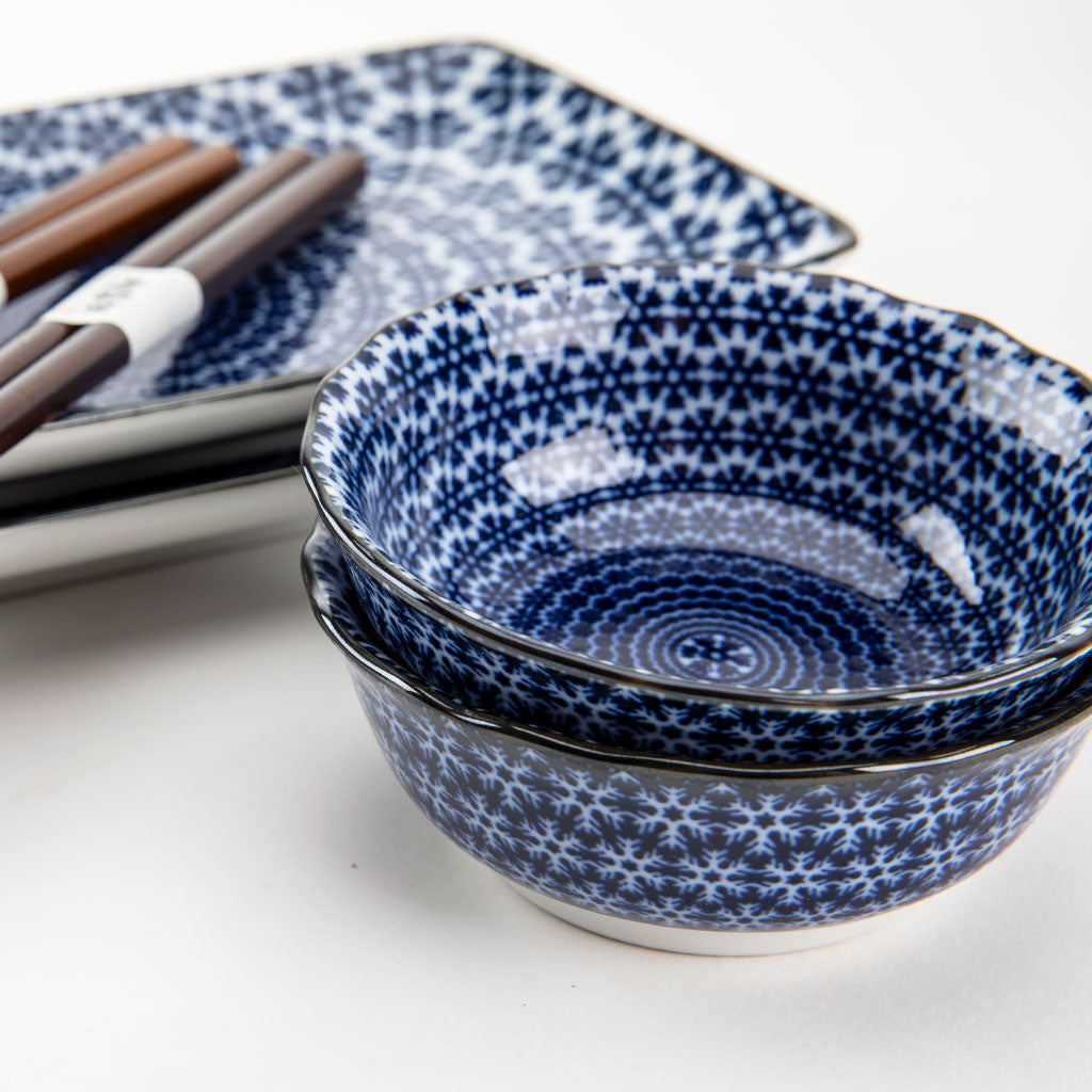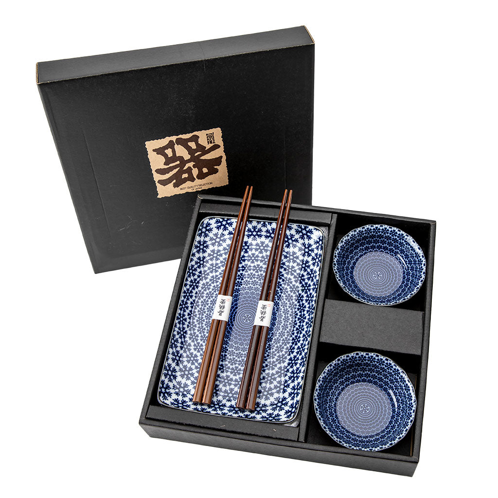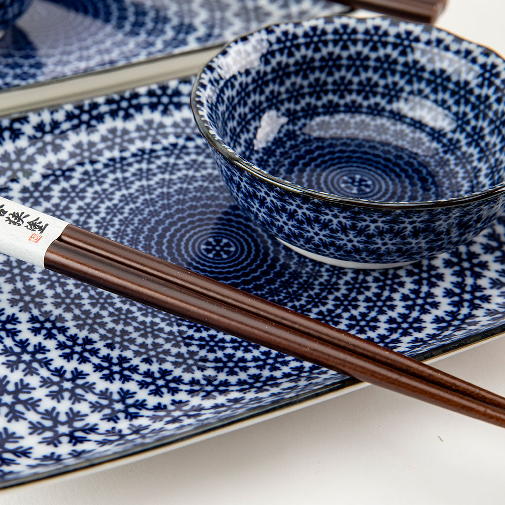 This Japanese sushi set is a blend of traditional elegance and modern functionality. Featuring a rectangular plate and two matching dipping bowls in indigo and white, it brings a touch of Japanese artistry to your table. The set is completed with a pair of wooden chopsticks, making it ideal for enjoying sushi, sashimi, or any of your favorite dishes.